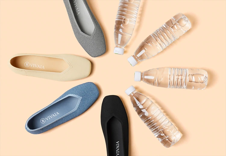 - VIVAIA uses 6 recycled plastic bottles for each pair of shoes. Its advanced 3D-knit technology minimizes waste by knitting the upper directly from recycled fibers—zero cut-offs, zero extra fabric waste.